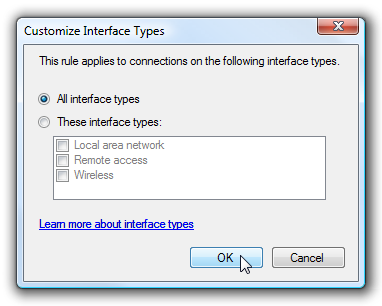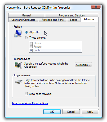 If you want more control over the rule, you can choose Properties from the menu, and choose which interfaces or profiles this rule applies to.