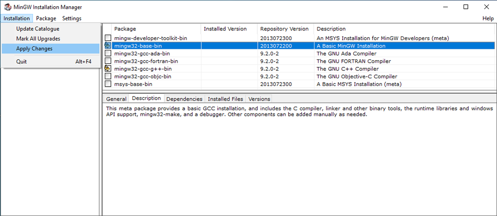 5. 勾選 mingw32-base-bin、mingw32-gcc-g++-bing 項目,按 Apply Changes。