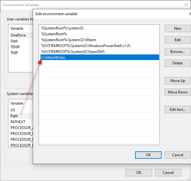 11. 為了解決步驟 9 的問題,要在環境變數的 Path 加入 C:\MinGW\bin 路徑。